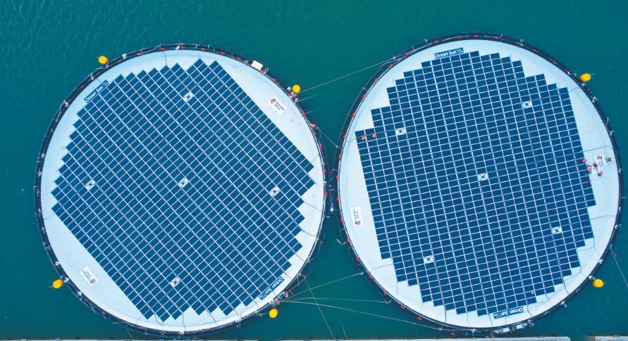 該項(xiàng)目位于山東省煙臺市海陽市南側(cè)海域,離岸30千米,水深30米。本次建設(shè)的500千瓦漂浮式海上光伏由兩個環(huán)形浮體單元組成,在直徑53米,面積相當(dāng)于4個標(biāo)準(zhǔn)籃球場的浮體單元上,共安裝了770塊光伏組件。該項(xiàng)目驗(yàn)證了浮體、錨固、發(fā)電組件抗風(fēng)浪能力以及風(fēng)光同場并網(wǎng)的技術(shù)可行性。