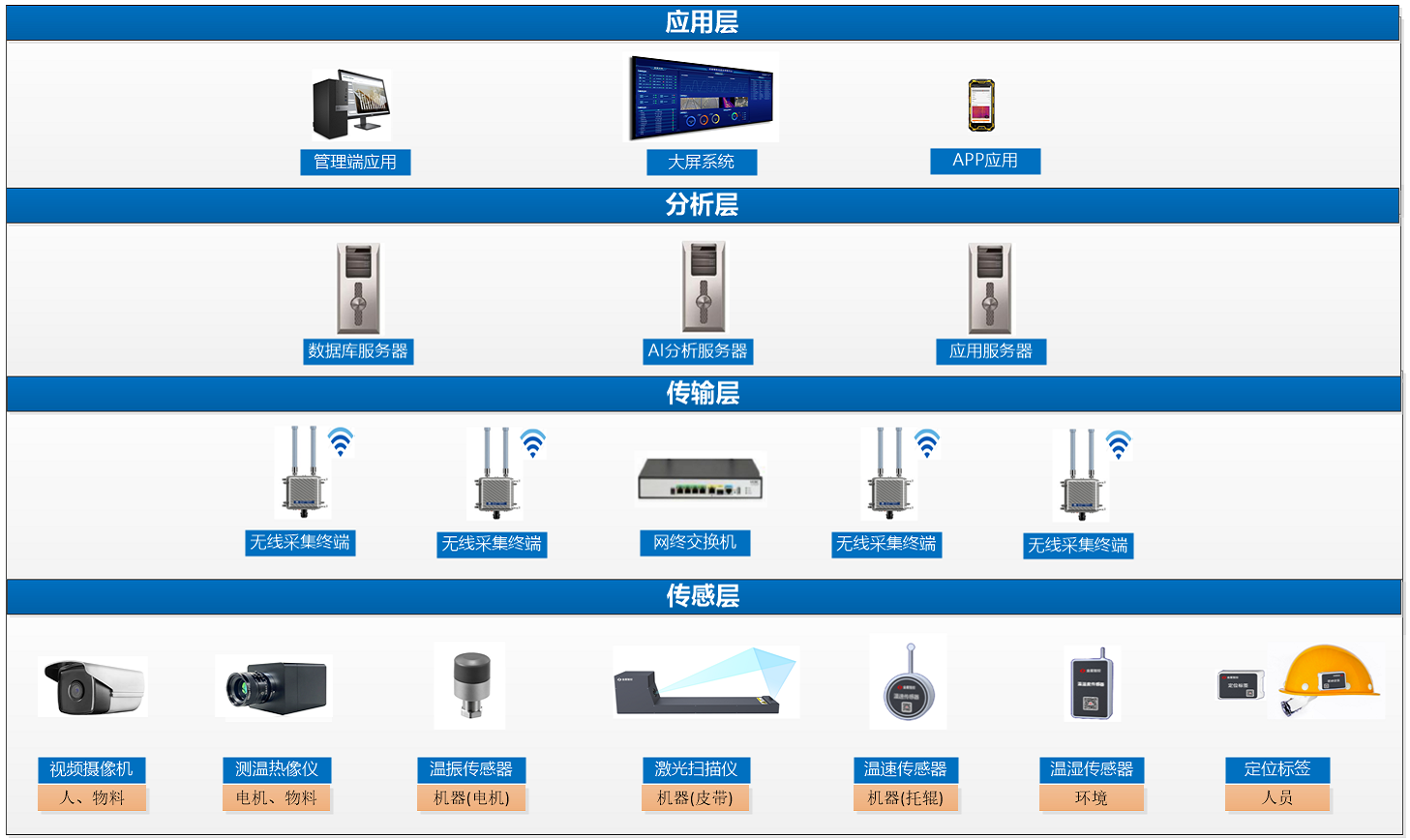 本解決方案針對(duì)當(dāng)下皮帶輸送裝置巡檢存在的痛點(diǎn),重點(diǎn)研發(fā)了面向皮帶撕裂和損傷檢測(cè)的激光掃描儀、用于托輥/滾筒狀態(tài)監(jiān)測(cè)的無(wú)線低功耗溫速傳感器、用于環(huán)境狀態(tài)監(jiān)測(cè)的無(wú)線低功耗溫濕傳感器、用于電機(jī)及減速機(jī)狀態(tài)監(jiān)測(cè)的無(wú)線低功耗溫振傳感器、用于人員定位的無(wú)線低功耗位置傳感器,并集成成熟的視頻攝像機(jī)、測(cè)溫?zé)嵯駜x,形成溫度、振動(dòng)、速度、圖像、視頻、位置六大在線感知技術(shù)融合,從而實(shí)現(xiàn)對(duì)皮帶輸送裝置安全生產(chǎn)四要素“人機(jī)料環(huán)”全面快速感知,并利用大數(shù)據(jù)、AI等技術(shù)實(shí)現(xiàn)皮帶輸送裝置全面狀態(tài)的實(shí)時(shí)監(jiān)測(cè)、多維分析及超前超警,從而保障皮帶輸送裝置高效安全運(yùn)行。