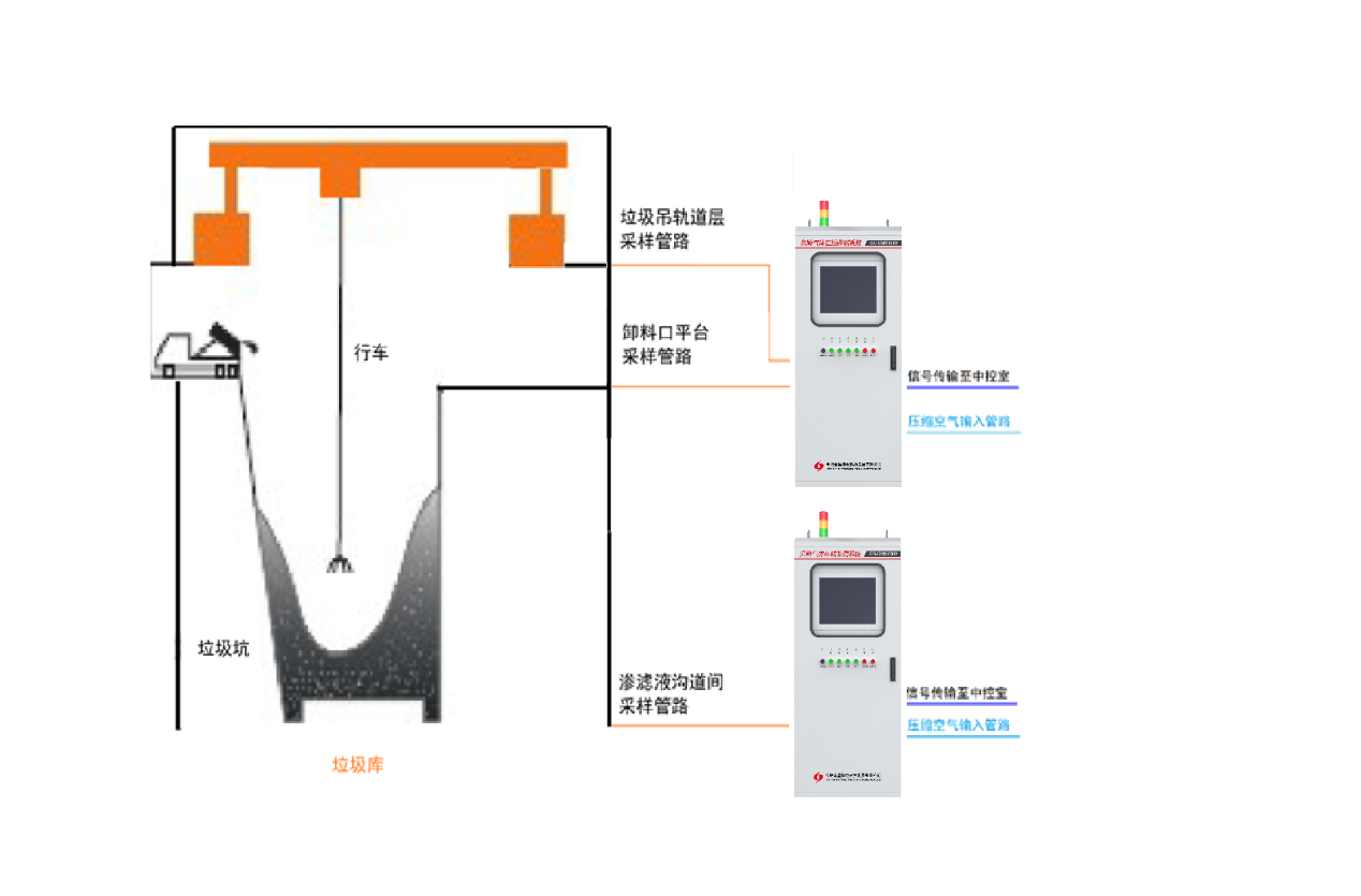 垃圾庫危險氣體檢測系統(tǒng)主要用于對垃圾庫內(nèi)危險氣體進行在線監(jiān)測,由于垃圾庫內(nèi)危險氣體的存在,本方案采用的裝置為多點抽取式,將檢測儀表安放在安全區(qū)域,各抽取頭分布在需要檢測的區(qū)域內(nèi),如滲濾液溝道、垃圾堆放區(qū)域等,通過間歇循環(huán)抽取實現(xiàn)多區(qū)域采樣,實現(xiàn)危險氣體間歇監(jiān)測,該方案具有自動抽取控制、氣體超限聲光報警、故障自診斷等功能,維護方面、校準簡單。
